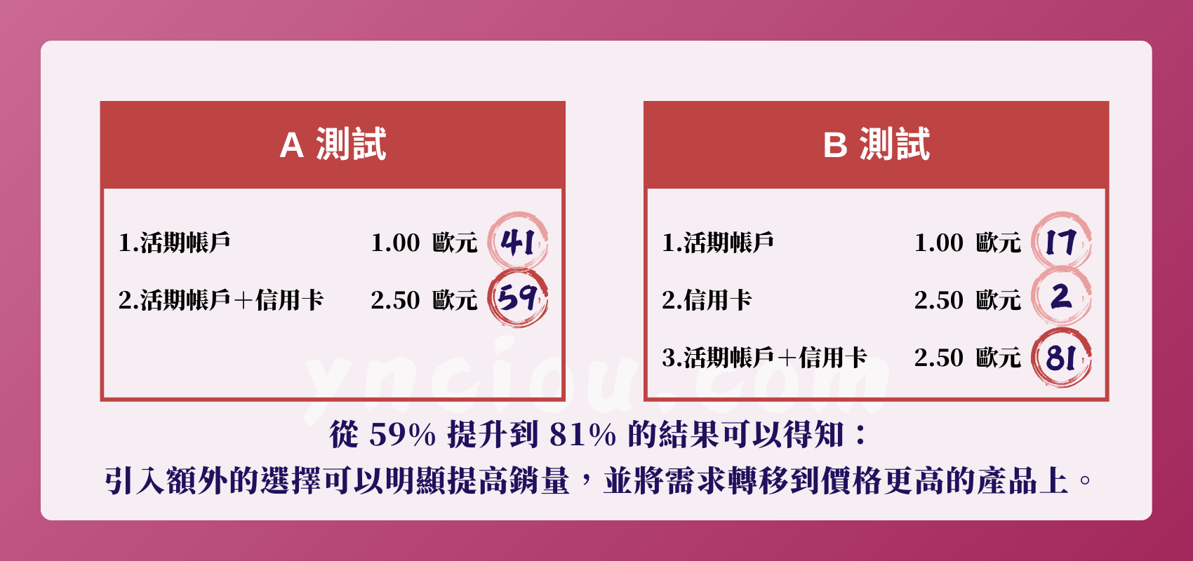 上圖是兩組不同產品選擇的研究結果,可以看得出來選擇略有不同,但是價格其實沒有改變,只是多了一個信用卡的選擇,就讓銷售比例從原本左邊的 59% 提升到 81%。